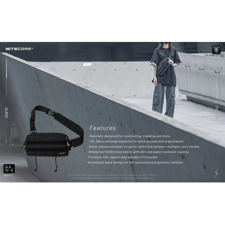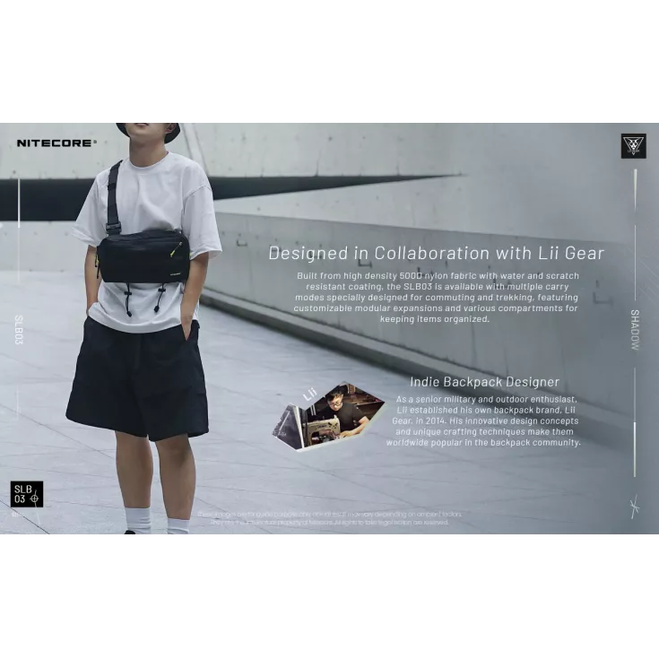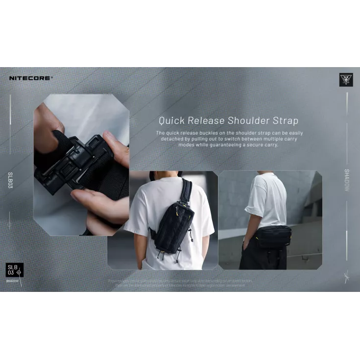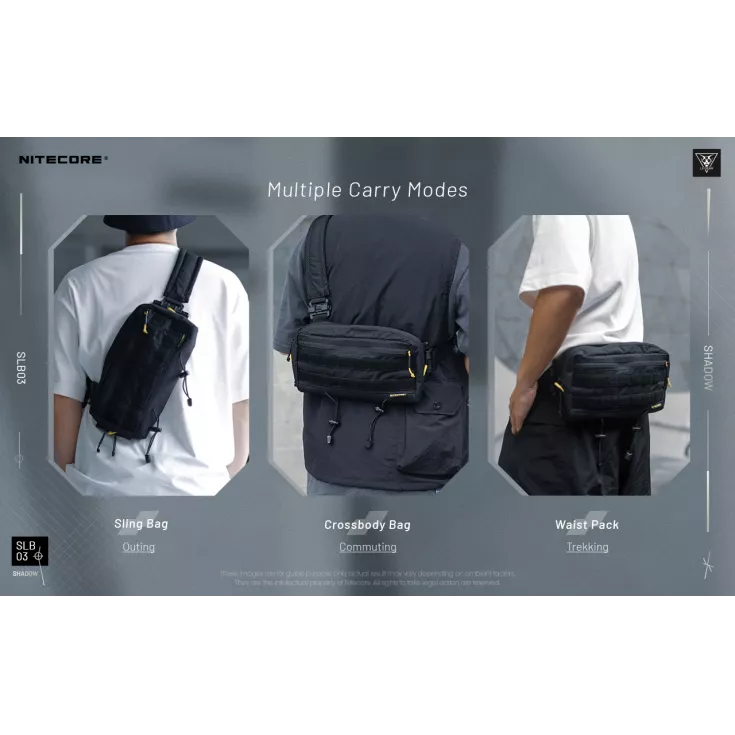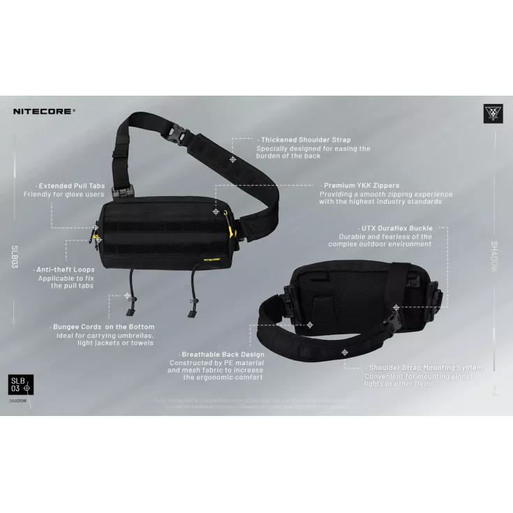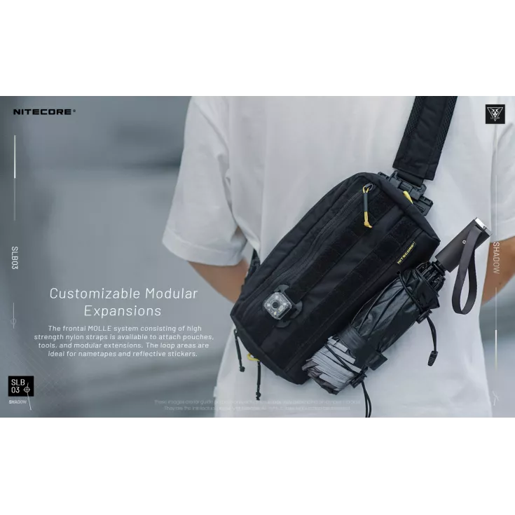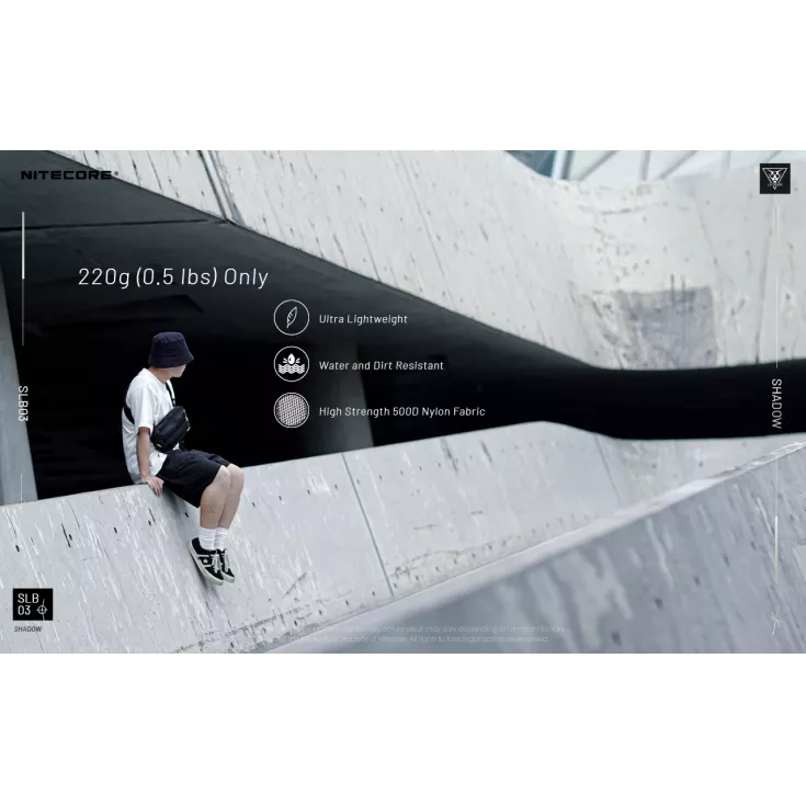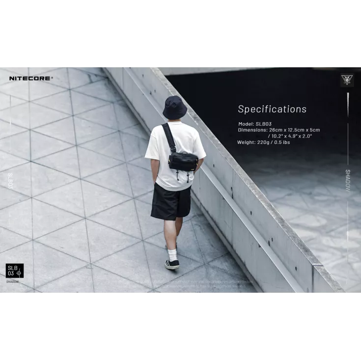 The Nitecore SLB03 Sling bag is the perfect accessory when commuting, trekking or for general use. With a 1.6 litre capacity, it can hold all your everyday essentials. The sling bag is made from high density 500D Nylon fabric with a water and scratch resistant coating.Â