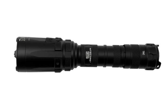 The Nitecore SRT6i is a very suitable flashlight for professional use, tactical purposes or simply at home or when you’re out camping. Thanks to some ingenious features, the light can be operated with one hand. This light has a maximum light output of no less than 2100 lumens and a range of 510 metres. It’s perfect for law enforcement and search operations. Around the reflector is a steel ring with silicon nitride glass breakers.