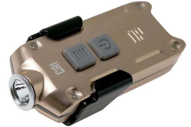 The NiteCore TIP CRI is a rechargeable keychain flashlight with a gold housing. A light with an output of 240 ANSI lumens. Quite a lot for a light this size! Especially when you consider that this light is rechargeable. Compared to the old TIP CRI model, this 2017 model has a handy clip, a ‘daily mode’ and a ‘constant-on mode’. The body is made from aluminium. Solidly constructed, for years of use.