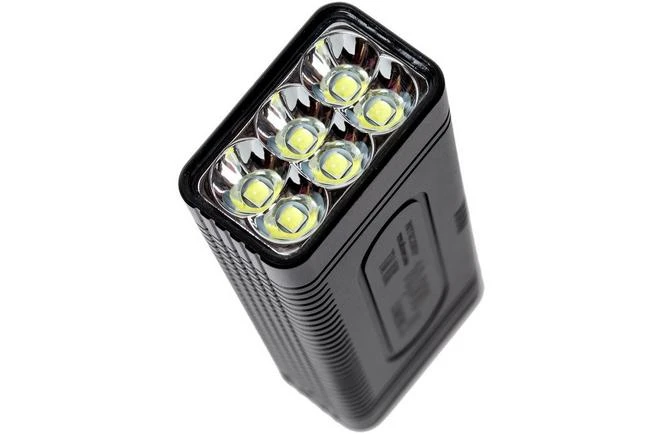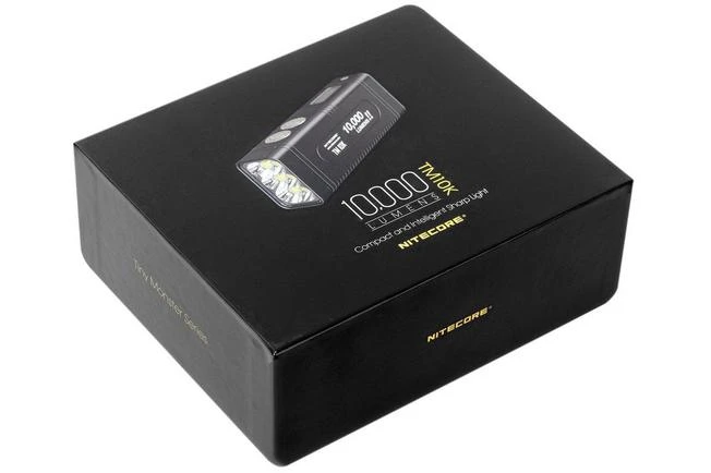 The Nitecore TM10K is a rechargeable flashlight from the Tiny Monster series. It’s the size of a smartphone, but make no mistake – the TM10K really is a Tiny Monster, delivering an unprecedented 10,000 lumens. To achieve this brightness, the TM10K has six Cree XHP35 HD LEDs and a model-specific rechargeable 4800mAh battery.