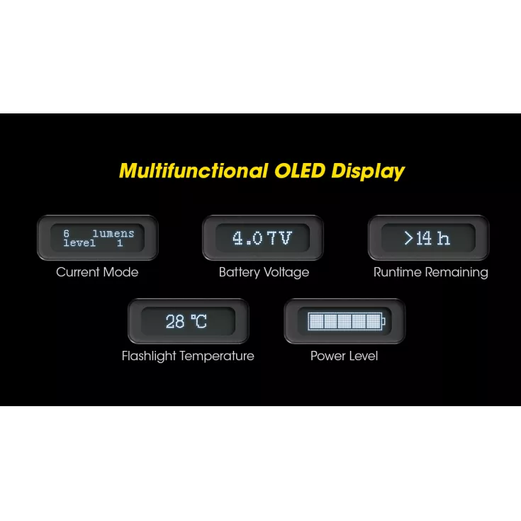 A multifunctional OLED display shows the current selected mode, battery voltage, runtime remaining and flashlight temperature.