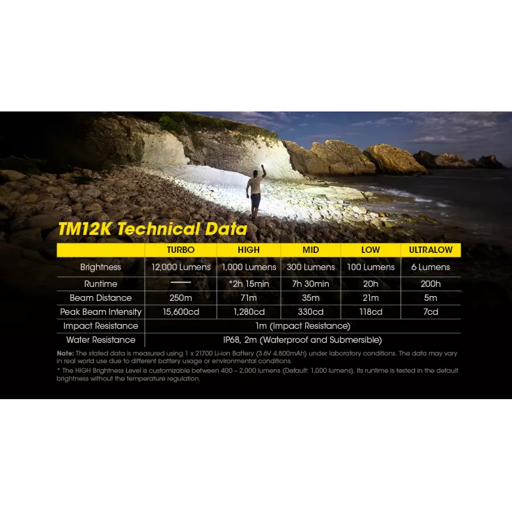 The Nitecore TM12K features six Cree XHP50 LEDs, with a maximum output of 12,000 lumens. The beam profile of this light is very wide, producing a wall of light.