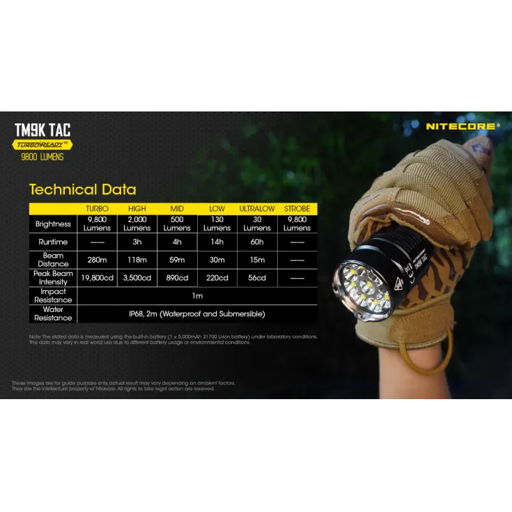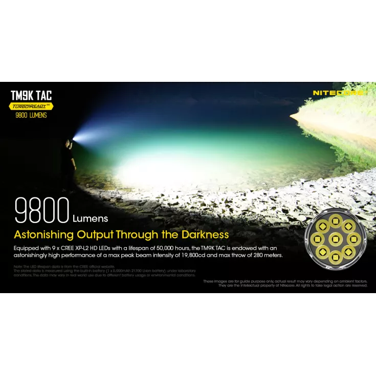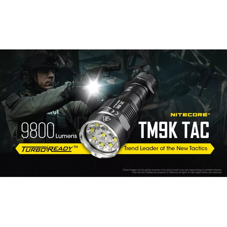 The Nitecore TM9K TAC is the tactical version of the popular TM9K. Equipped with 9 x Cree XP-L2 LED that produce a wall of light and a maximum brightness of 9800 lumens.