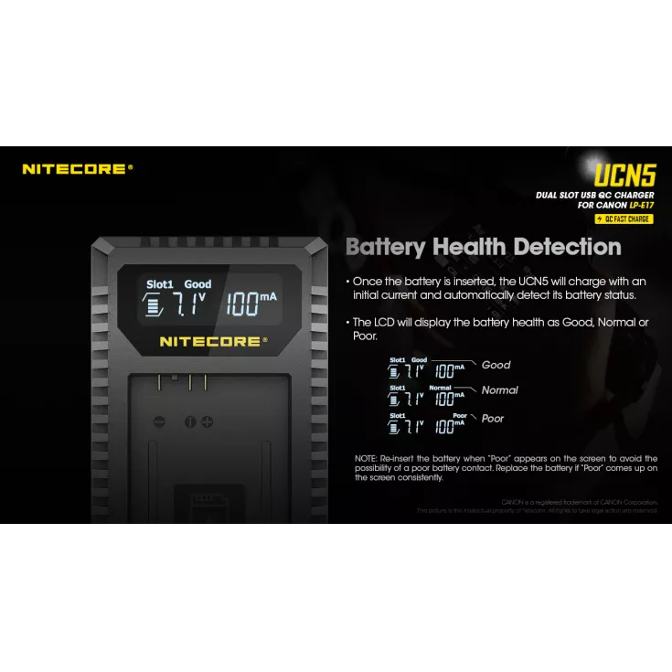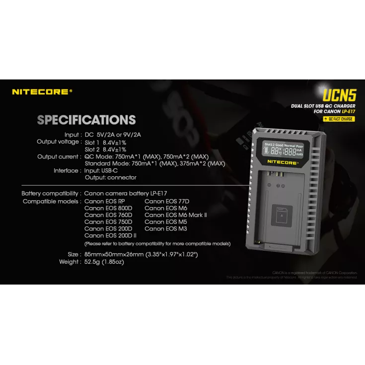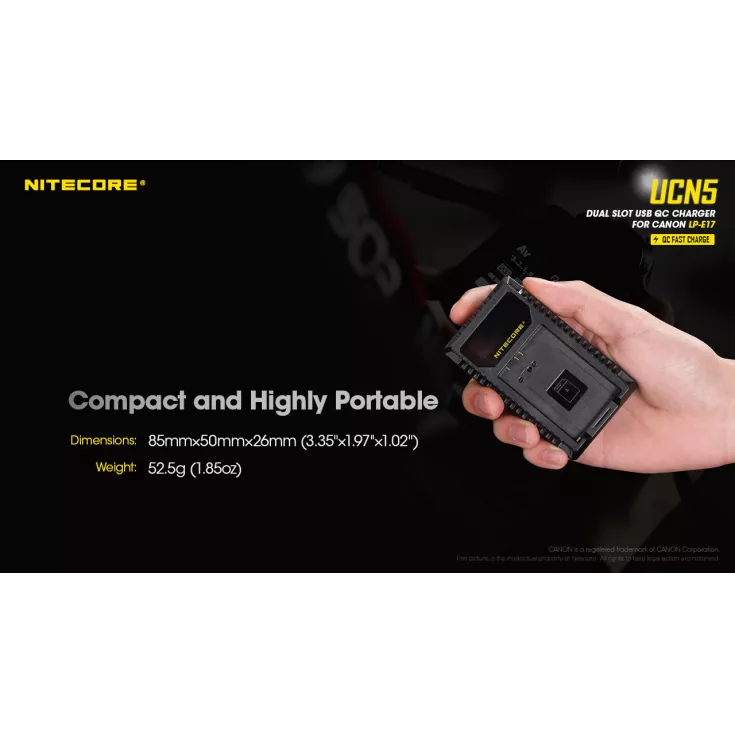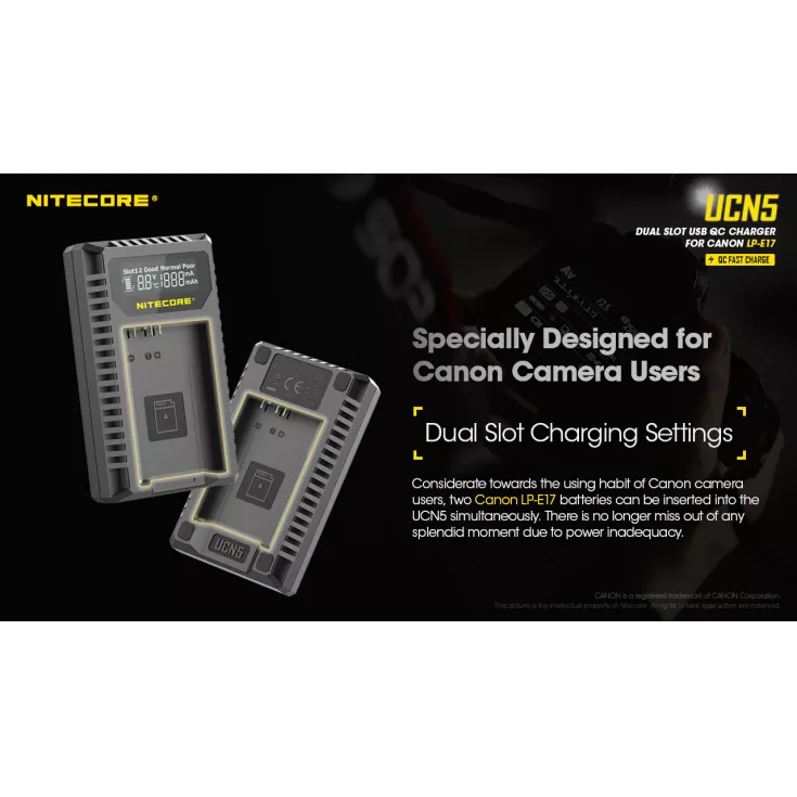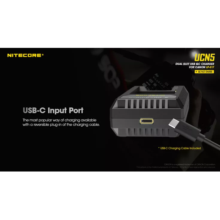 The Nitecore UCN5 is a dual slot USB charger for Canon LP-E7 batteries. Featuring a USB-C input port, the charger is compatible with multiple power sources, including power adapter, power banks and solar chargers.