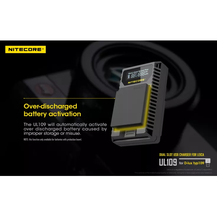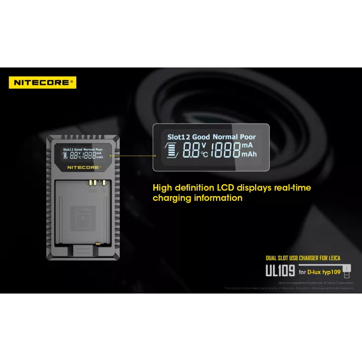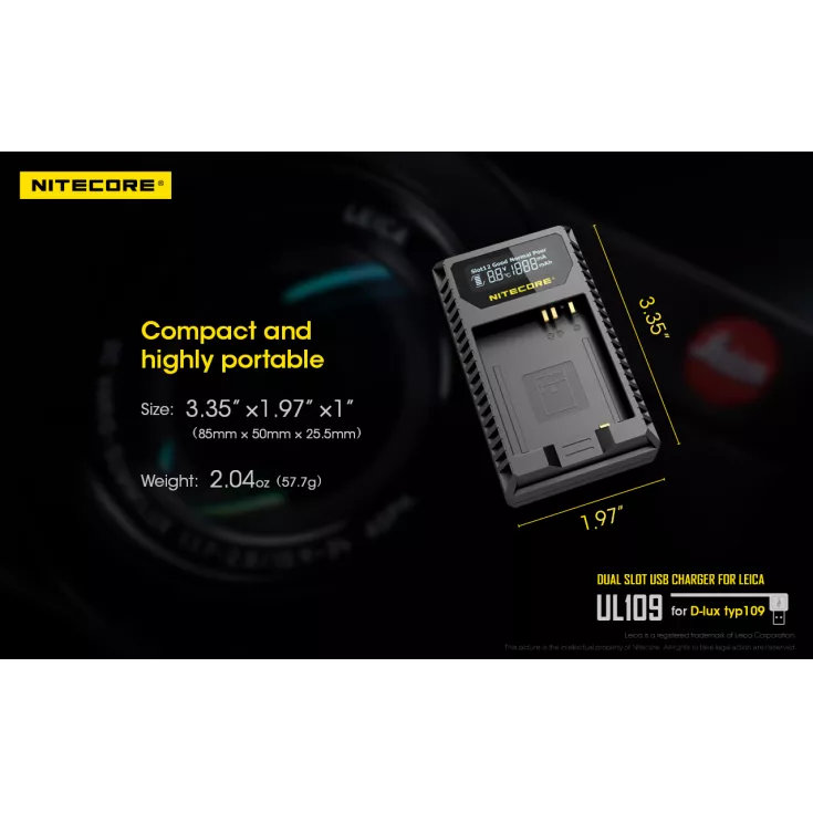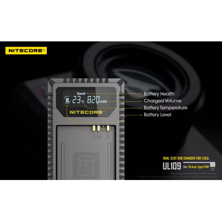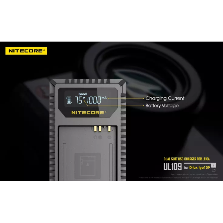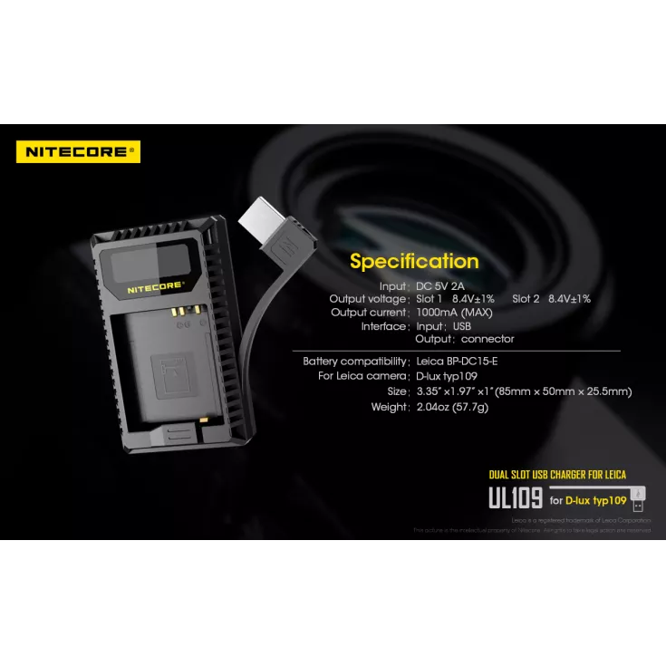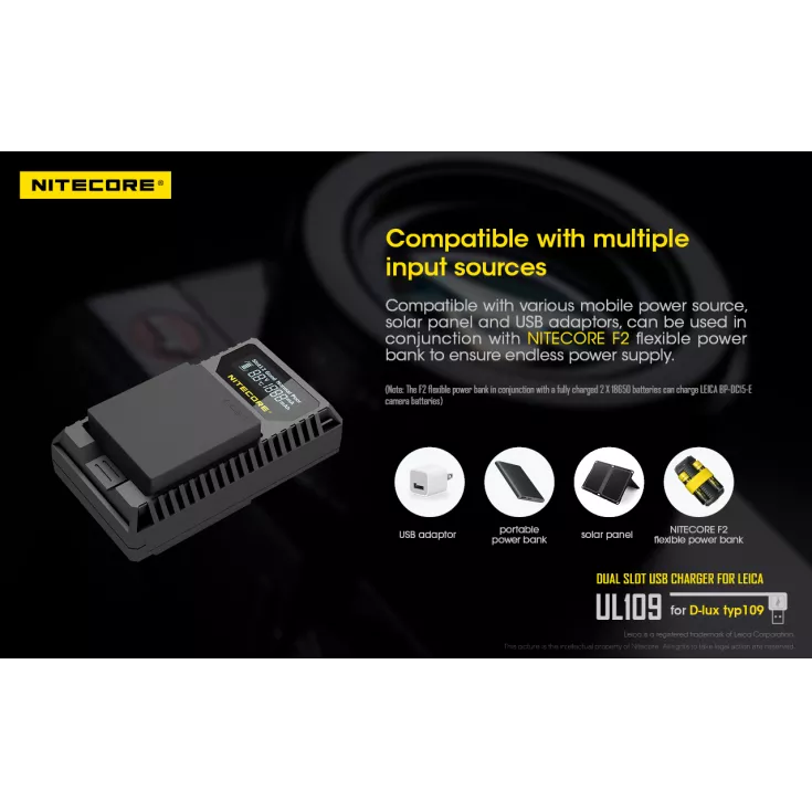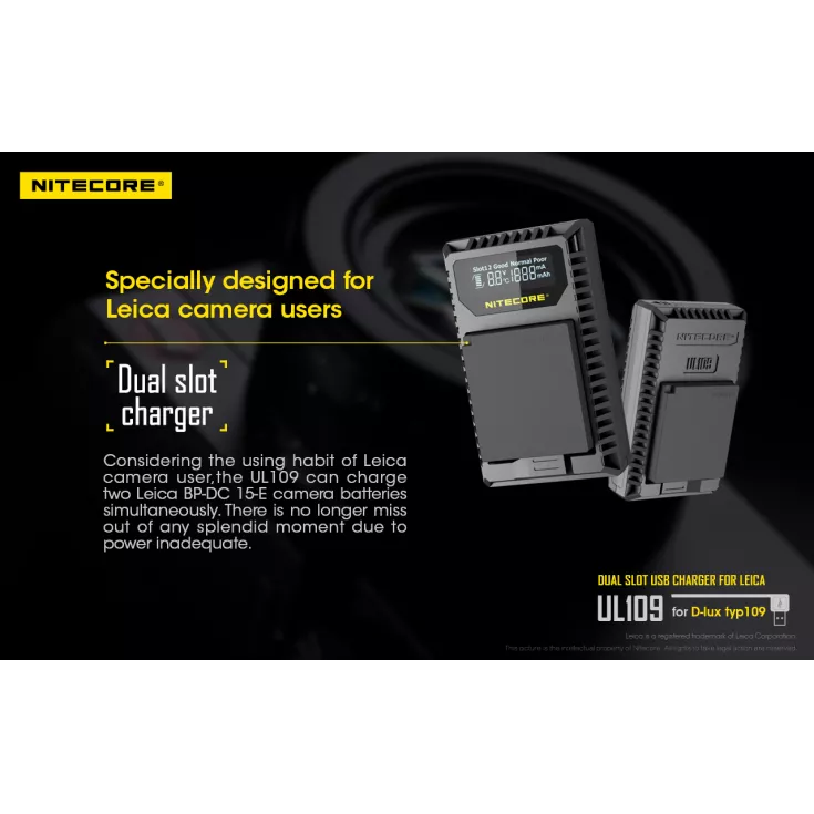 The Nitecore UL109 is a dual slot USB charger, specially designed for the Leica D-lux typ109 camera which is compatible with the BP-DC15-E battery. Compatible with a range of input sources, the UL109 takes it power via a USB cable which makes it compatible with power banks, solar panels and USB adapters.