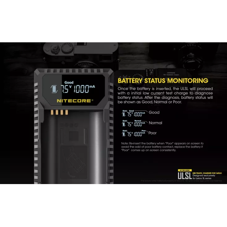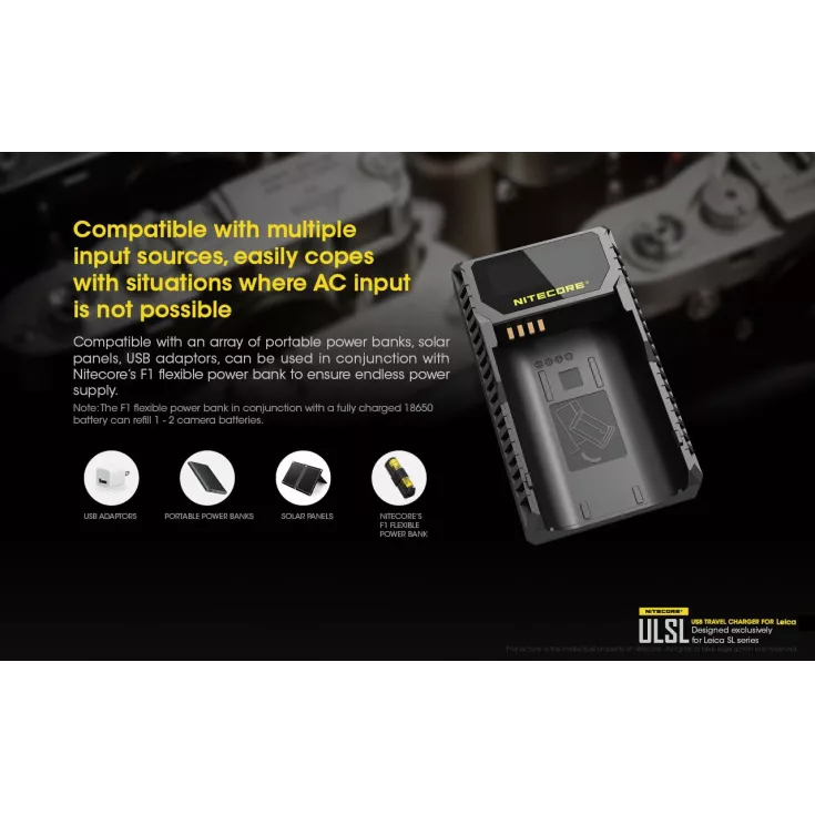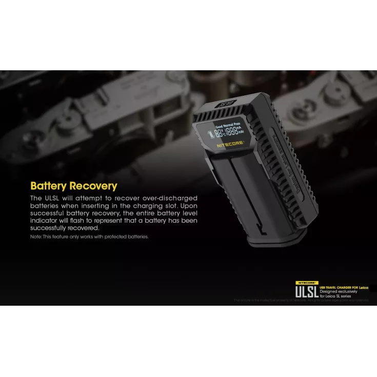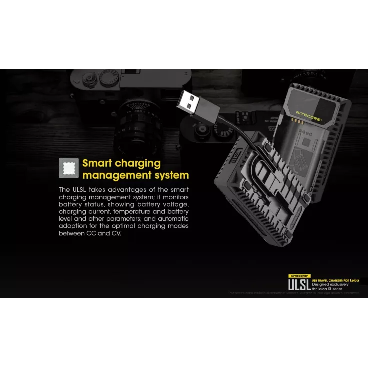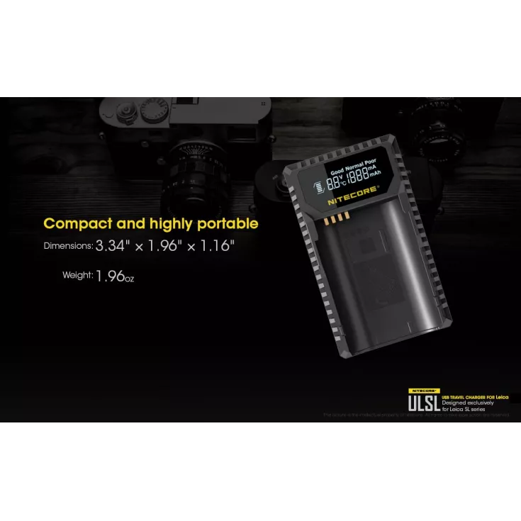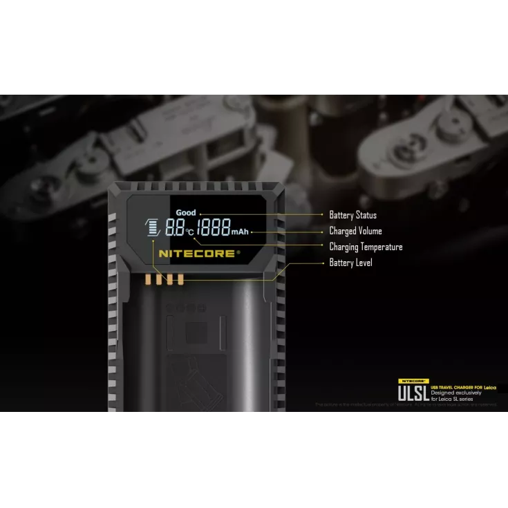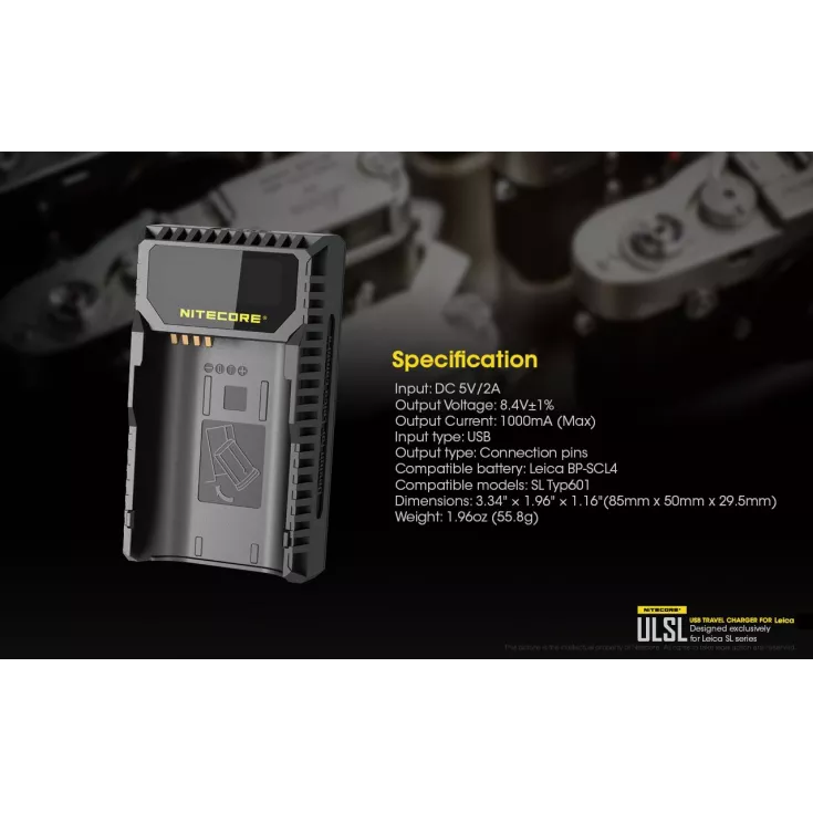 The Nitecore ULSL is a USB charger for Leica camera batteries in the SL series and is specifically compatible with the Lieca BP-SCL4.Â