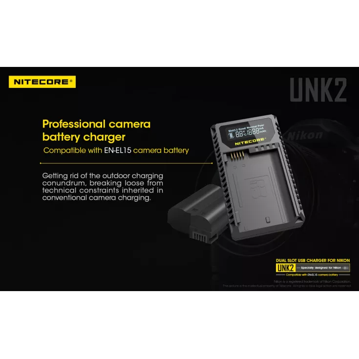 The Nitecore UNK2 battery charger is compatible with the Nikon EN-EL15 camera battery, which is used in a range of Nikon cameras, including the D500, D7500 and Nikon 1V1. The charger is compatible with various power sources, including solar panels, power banks and USB adapters.