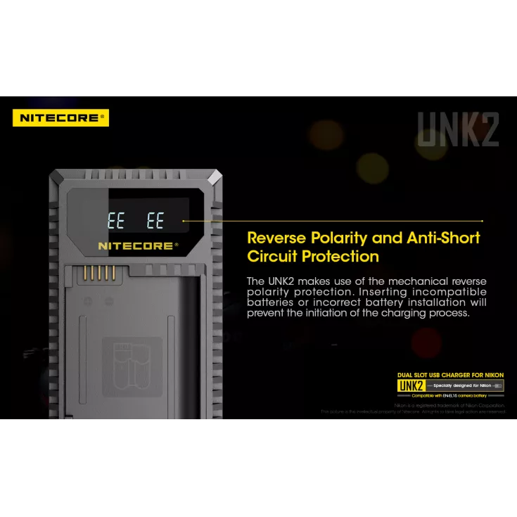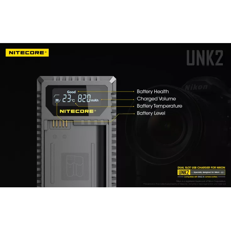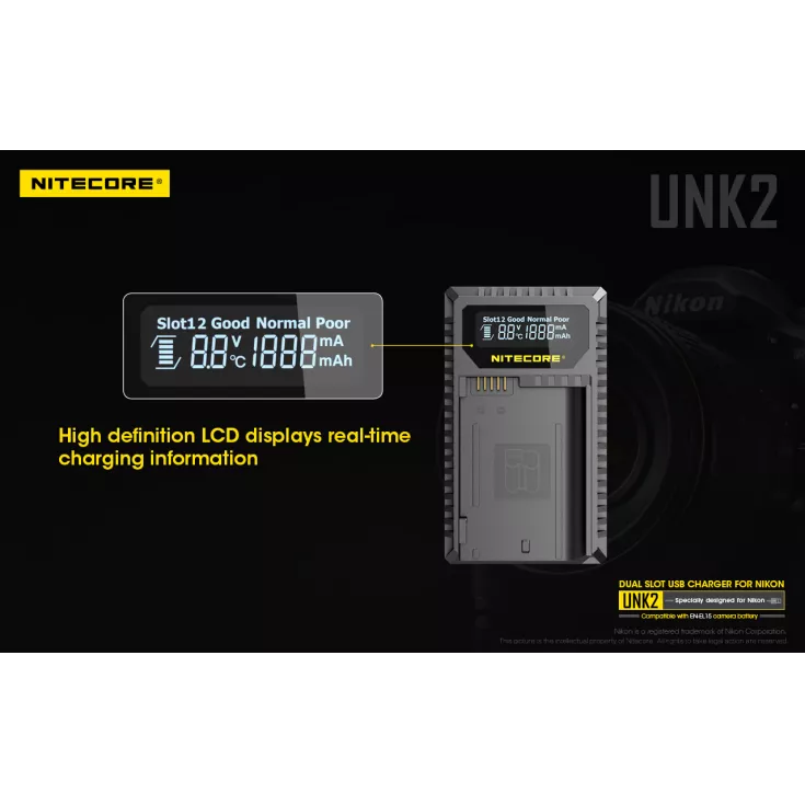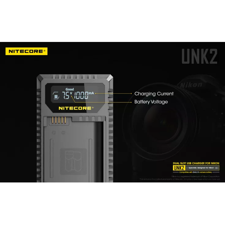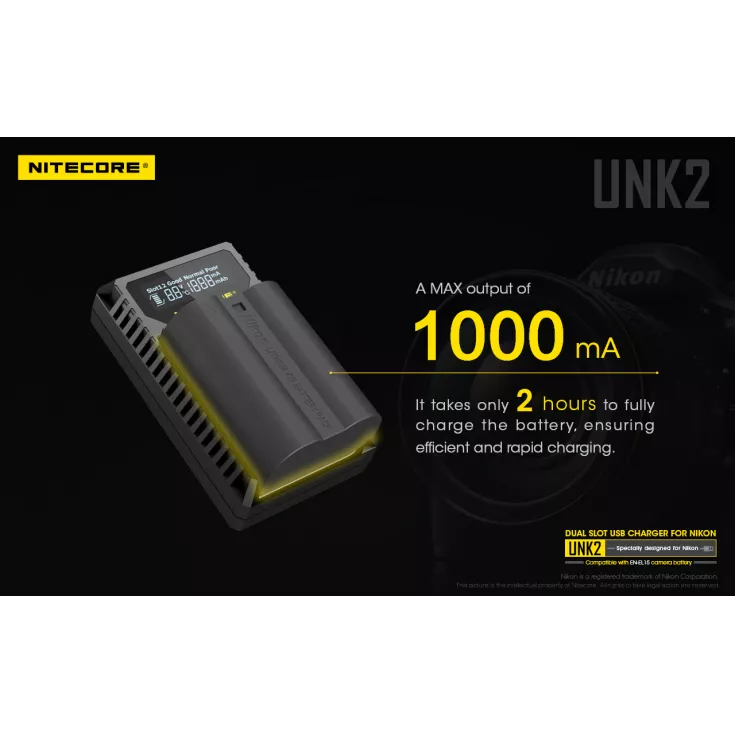Nitecore have carefully considered the requirements of a photographer and created a charger that can charge two of the Nikon batteries simultaneously, to ensure no moment is missed due to power inadequacy. The slots have a maximum output of 1000mA, providing fast and efficient charging.Â