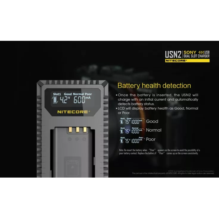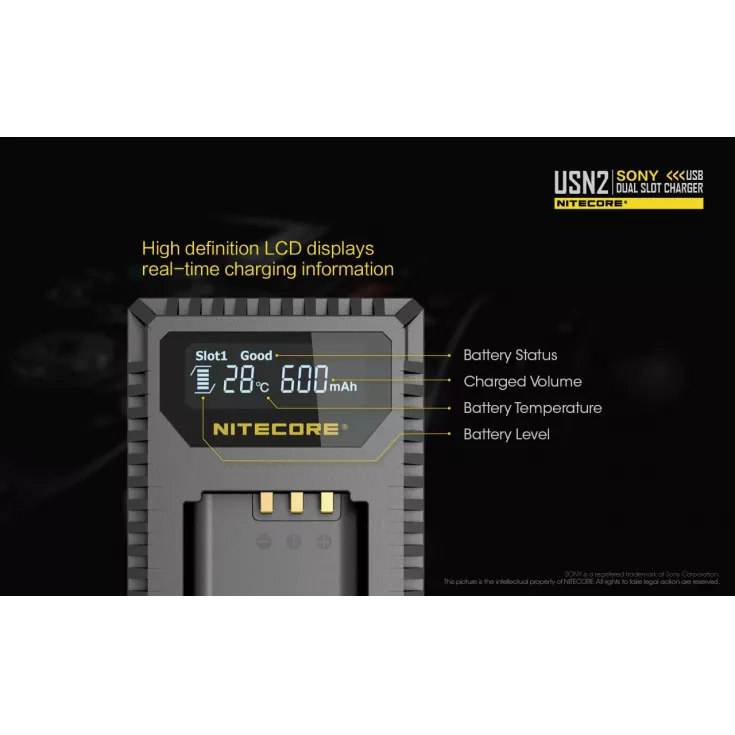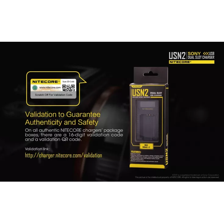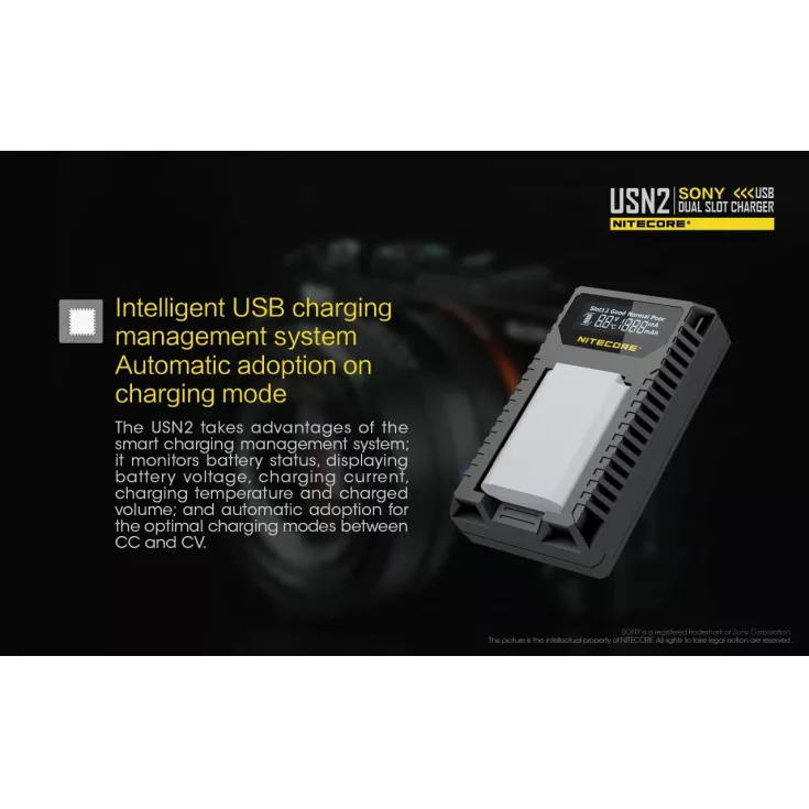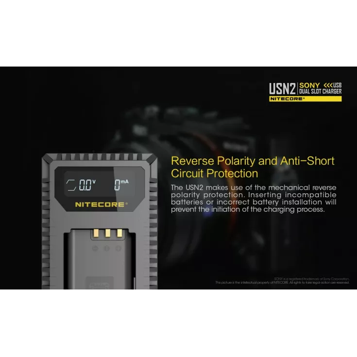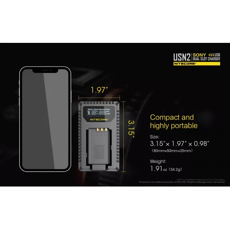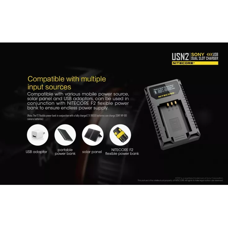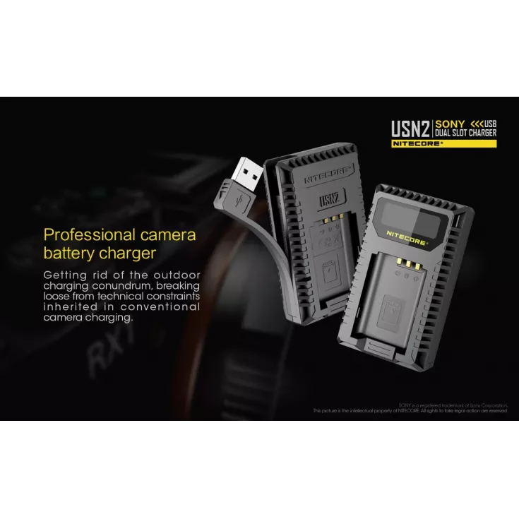 The Nitecore USN2 is a dual slot USB camera charger for the Sony NP-BX1 battery. The professional charger breaks free from technical constraints often come across with conventional camer charging, instead providing a travel-friendly charging solution.Â