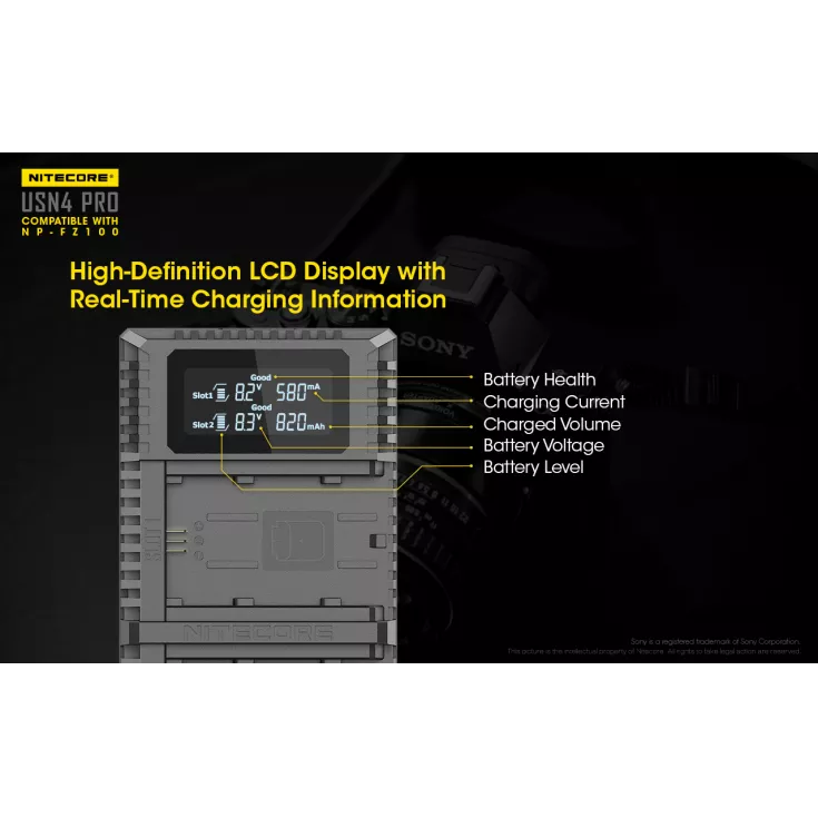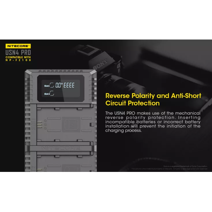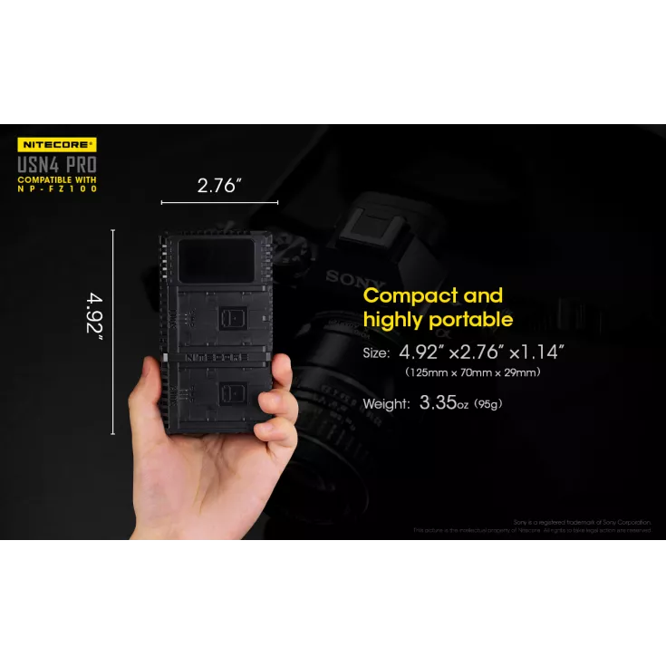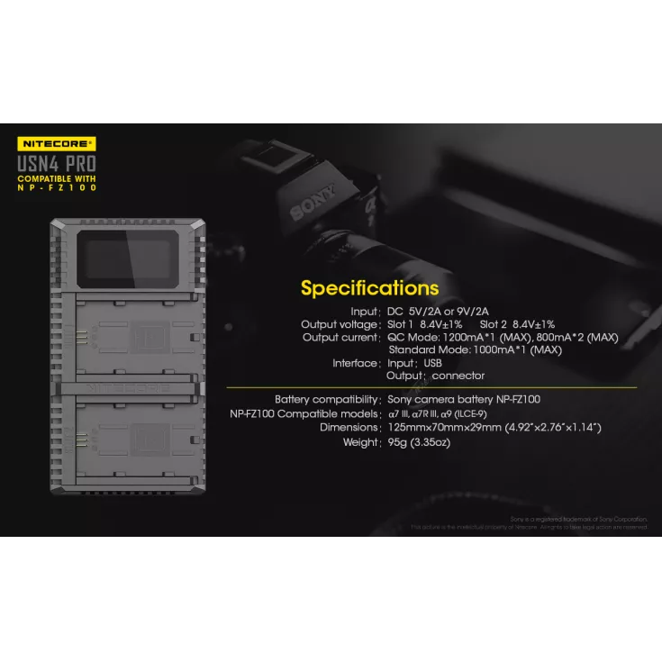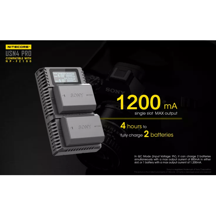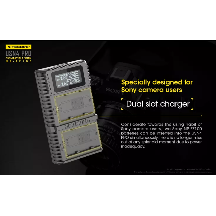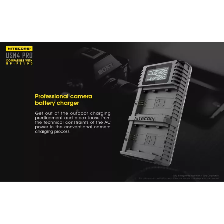 The Nitecore USN4 Pro is a dual slot USB charger, designed for the Sony NP-FZ100 camera battery and ideal for travel. Providing an alternative to a conventional camera charger, the USN4 Pro makes your gear lighter and allows for convenient charging on the go.Â