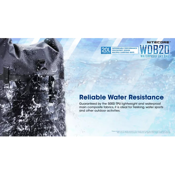 The Nitecore WDB20 is a 20 litre capacity waterproof dry bag constructed from durable 500D TPU material.